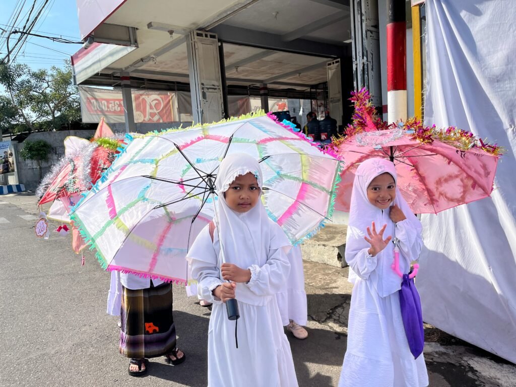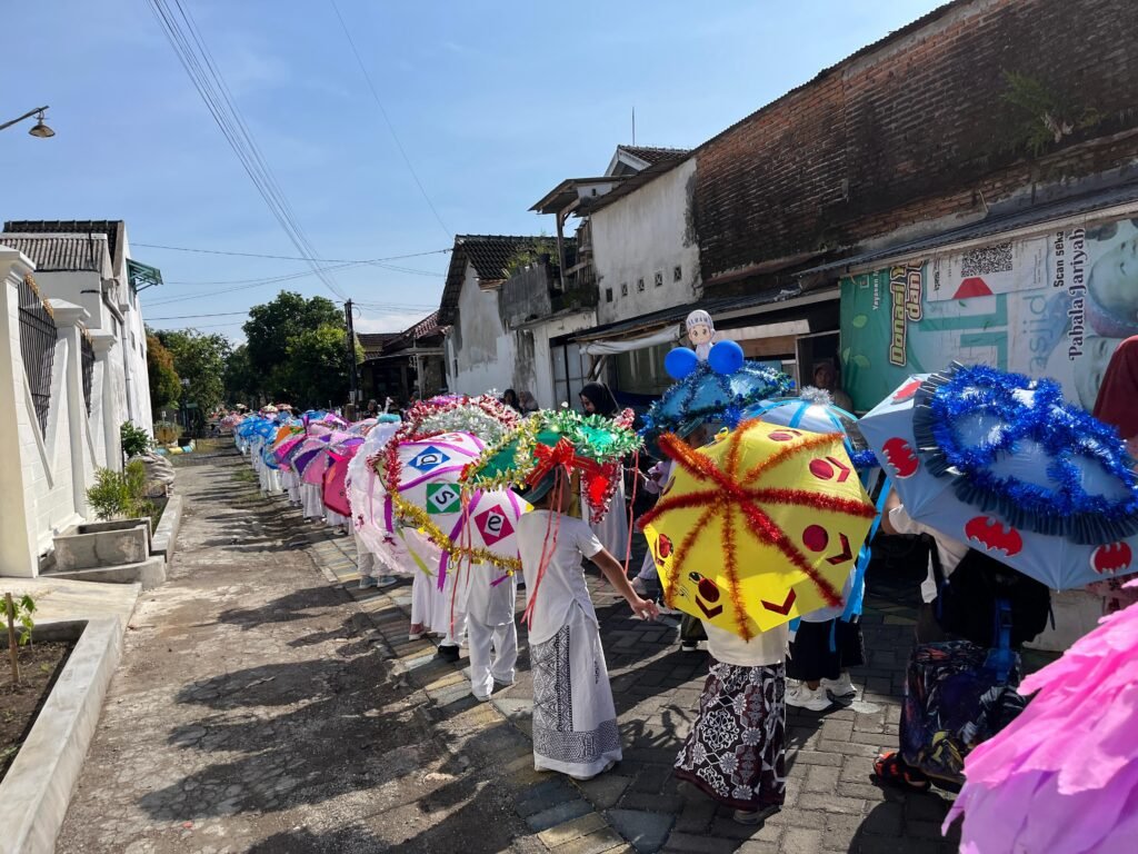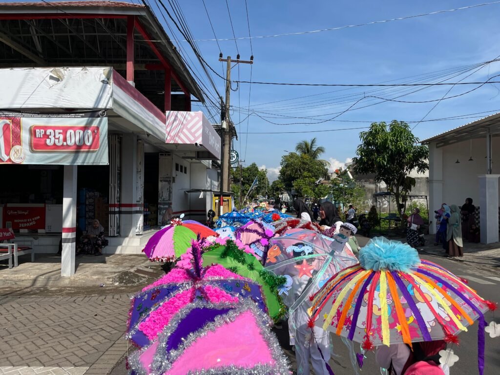 Tidak jarang beberapa payung hampir saling bertabrakan karena ukuran atau hiasan tinggi, tetapi hal ini justru menambah keseruan parade. Anak-anak tertawa dan saling menyesuaikan langkah, menciptakan momen spontan yang membuat parade lebih hidup dan energik.