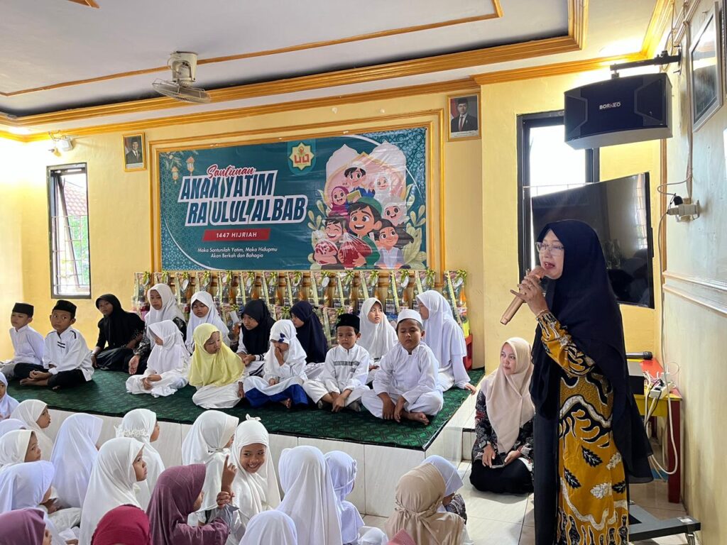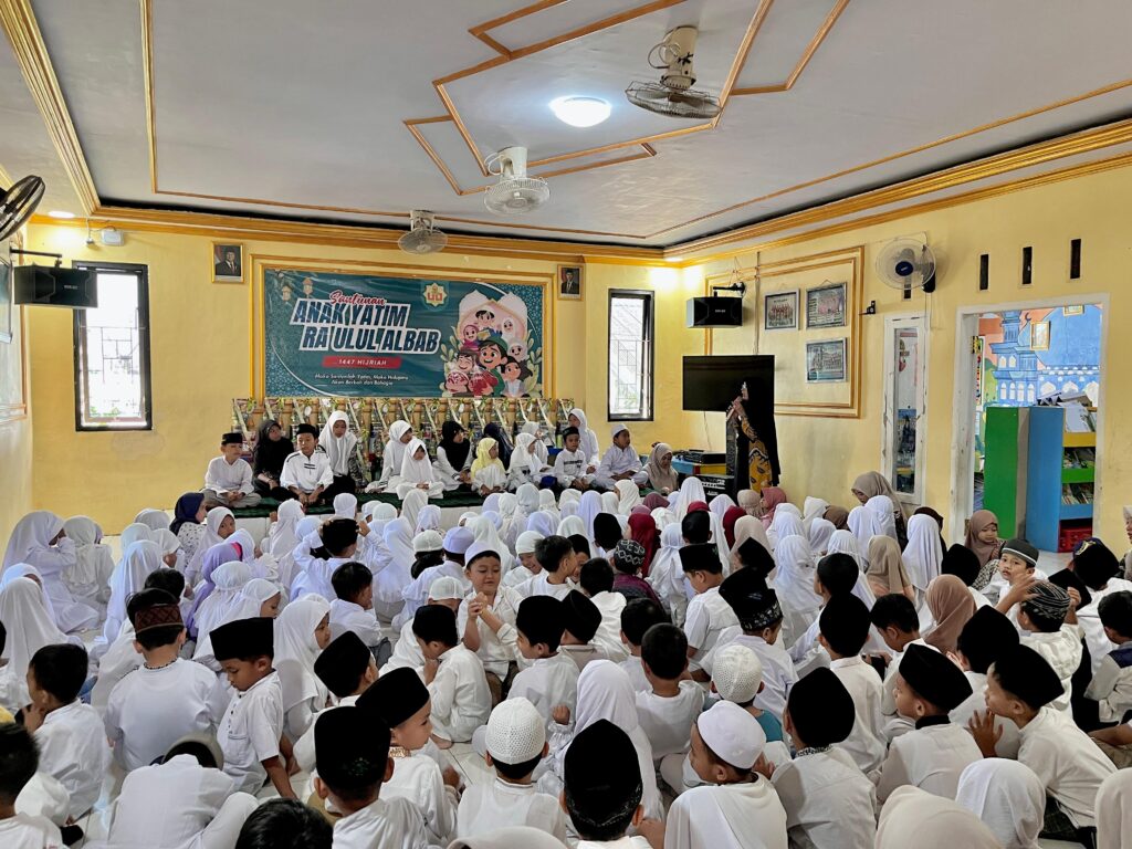 Kegiatan diawali dengan seluruh siswa dari berbagai kelas berkumpul bersama di aula atas RA Ulul Albab. Para siswa duduk rapi di bawah pentas aula, sementara anak-anak yatim ditempatkan di bagian pentas sebagai bentuk penghormatan dan perhatian khusus kepada mereka.