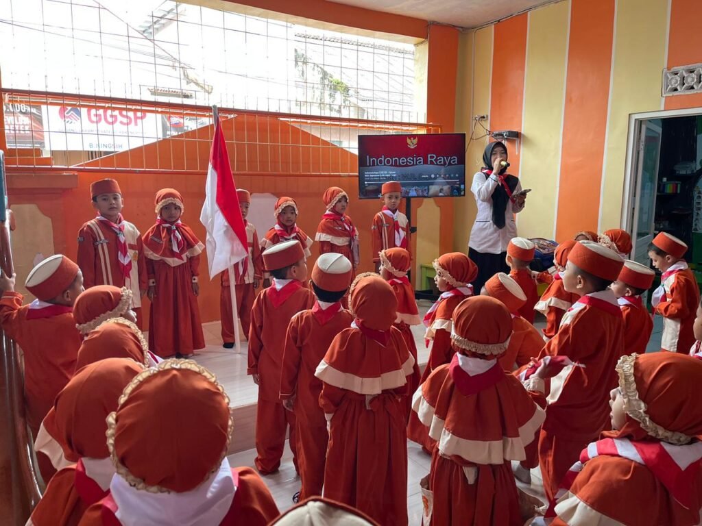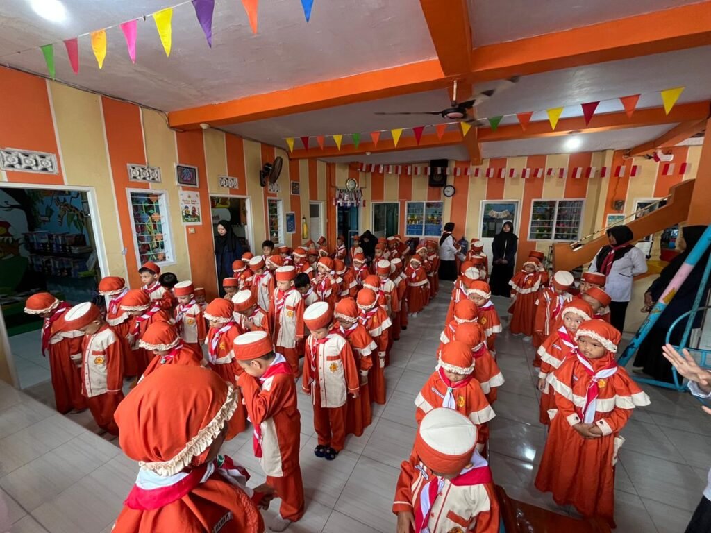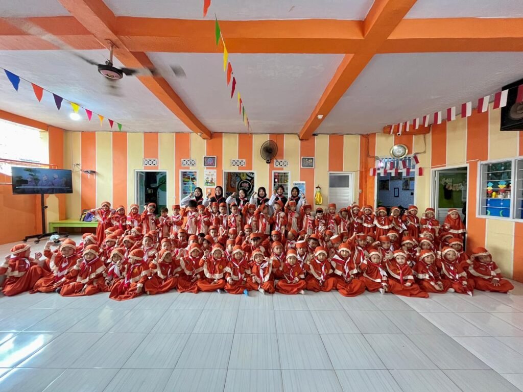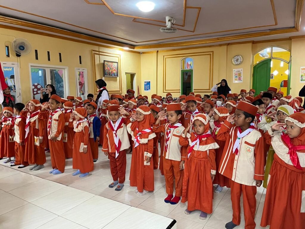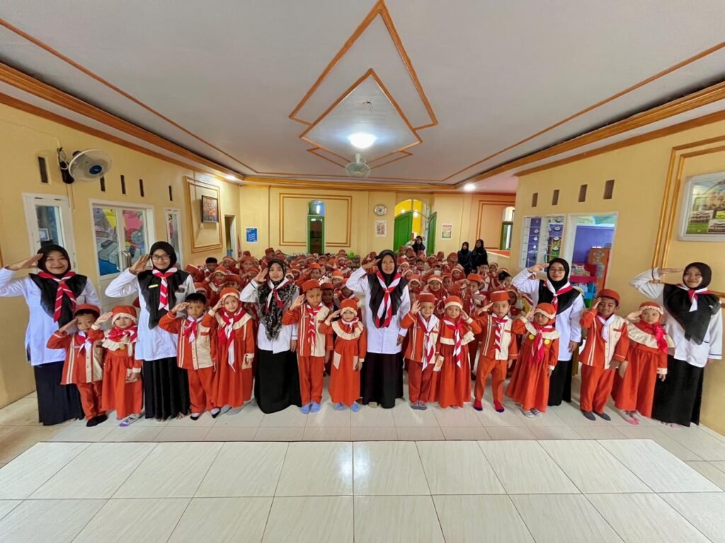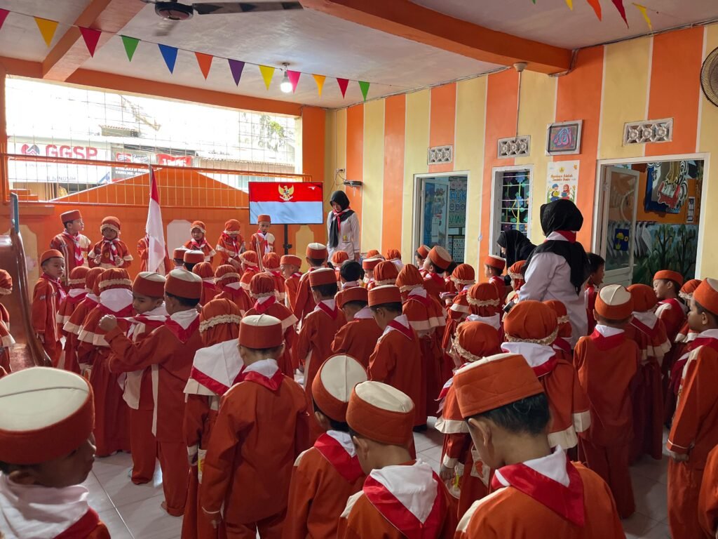 Sejak pagi, lingkungan RA Ulul Albab tampak semarak. Anak-anak datang dengan raut wajah ceria, mengenakan seragam khas hari Senin lengkap dengan hasduk merah putih di lehernya. Tak hanya peserta didik, para guru pun turut mengenakan seragam dan hasduk yang sama, mencerminkan kekompakan serta kebersamaan dalam memperingati hari bersejarah ini.